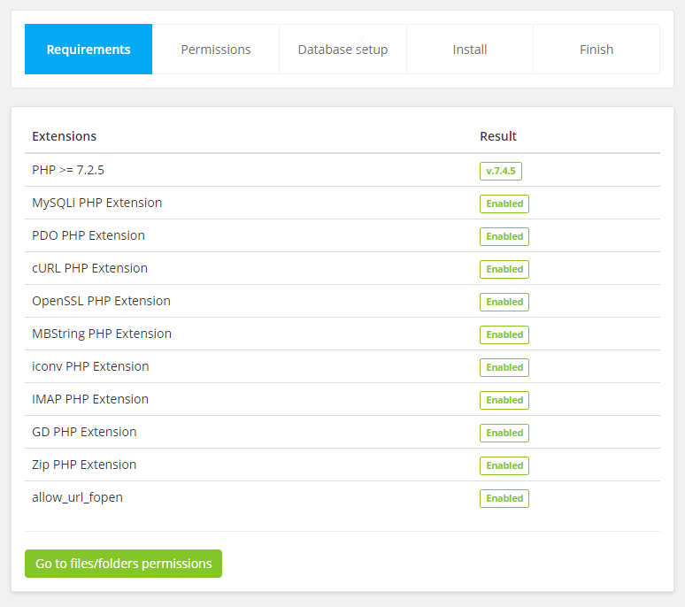 If all server requirements passed click Go to Files/Folders Permissions otherwise consult with your hosting provider to fix/enable them.